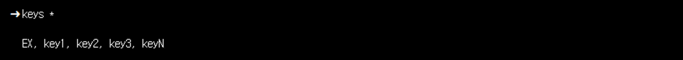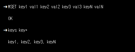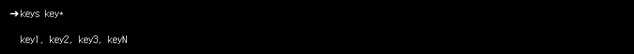 ex 결과 h?llo h와 llo 사이에 문자 1개 들어가 있는 모든 key 검색 matches hello, hallo and hxllo h*llo h와 llo 사이에 아무 문자열이 들어가 있는 모든 key 검색 matches hllo and heeeello h[ae]llo h와 llo 사이에 a 또는 e가 들어가 있는 모든 key 검색 matches hello and hallo, but not hillo h[^e]llo h와 llo 사이에 e가 아닌 문자가 들어가 있는 key 검색 matches hallo, hbllo, ... but not hello h[a-d]llo h와 llo 사이에 a 또는 b 또는 c 또는 d가 들어가있는 key 검색 matches hallo and hbllo * 모든 key 검색
