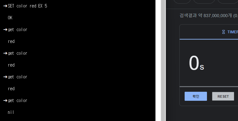 초단위로 지정-- color 키 생성 및 5초 후 삭제 SET color red EX 5