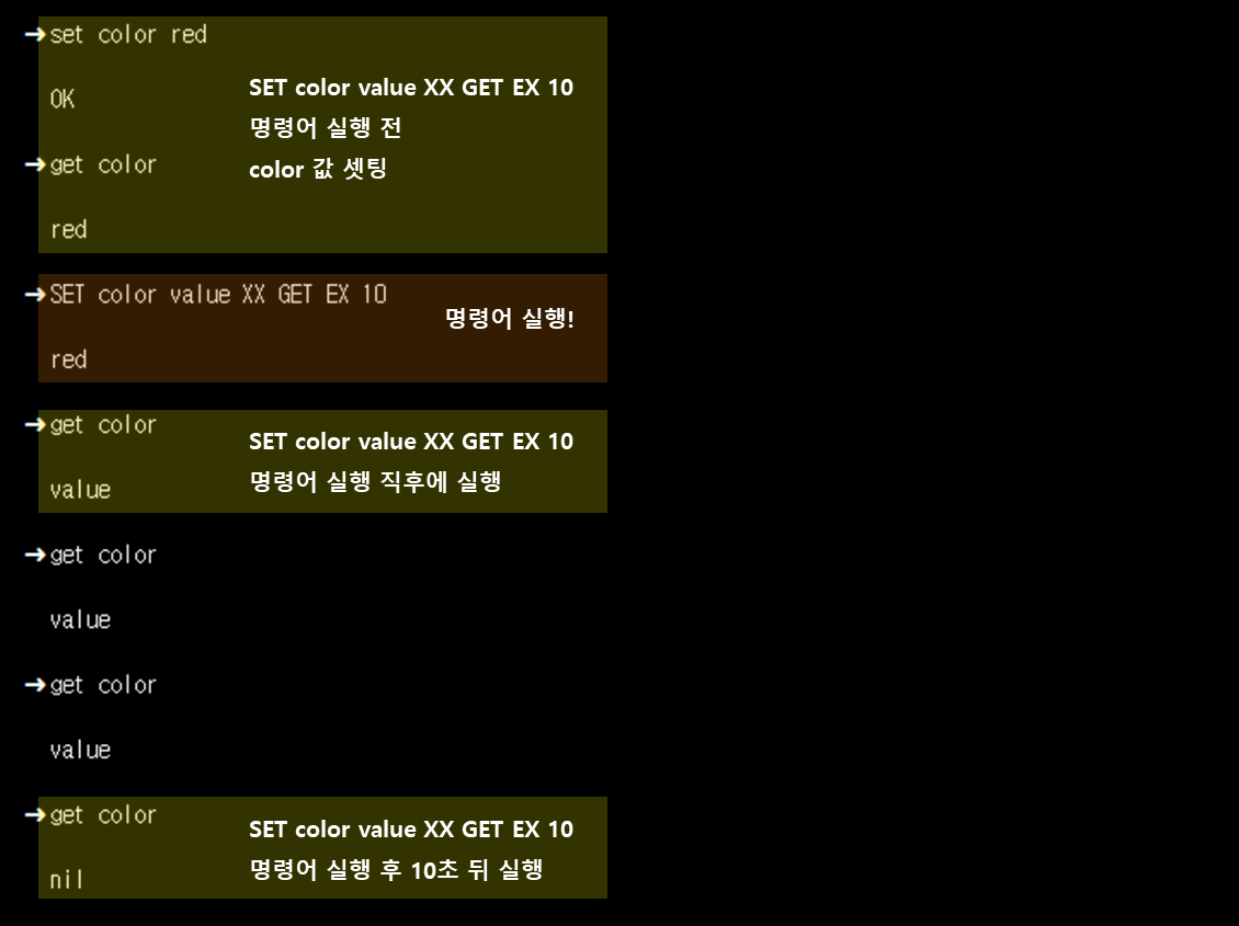SET color value XX GET EX 10color 키가 이미 존재한다면, 값이 value 인 color 키를 생성하는데, 기존의 값을 반환하고 value로 덮어씌운 뒤, 10초 뒤에 color 폭파(제거)