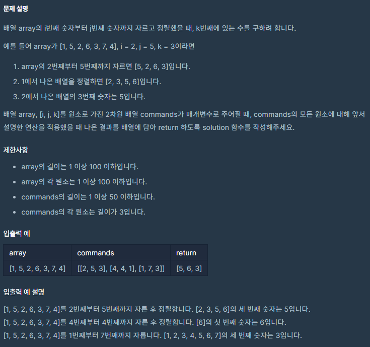 public int[] test(int[] array, int[][] commands) { int[] answer = new int[commands.length]; int idx = 0; for (int[] arg : commands) { int[] list = Arrays.copyOfRange(array, arg[0] - 1, arg[1]); Arrays.sort(list); answer[idx++] = list[arg[2] - 1]; } return answer; }1. 변수 생성