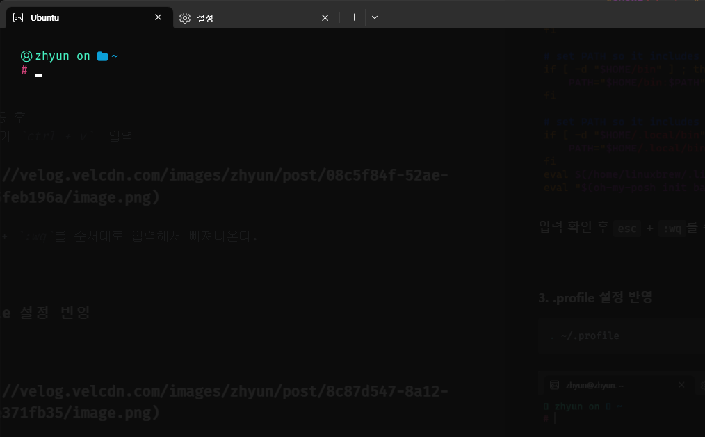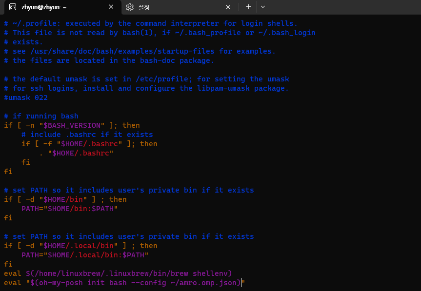 vi .profile커서로 맨 아래로 이동 후 알파벳