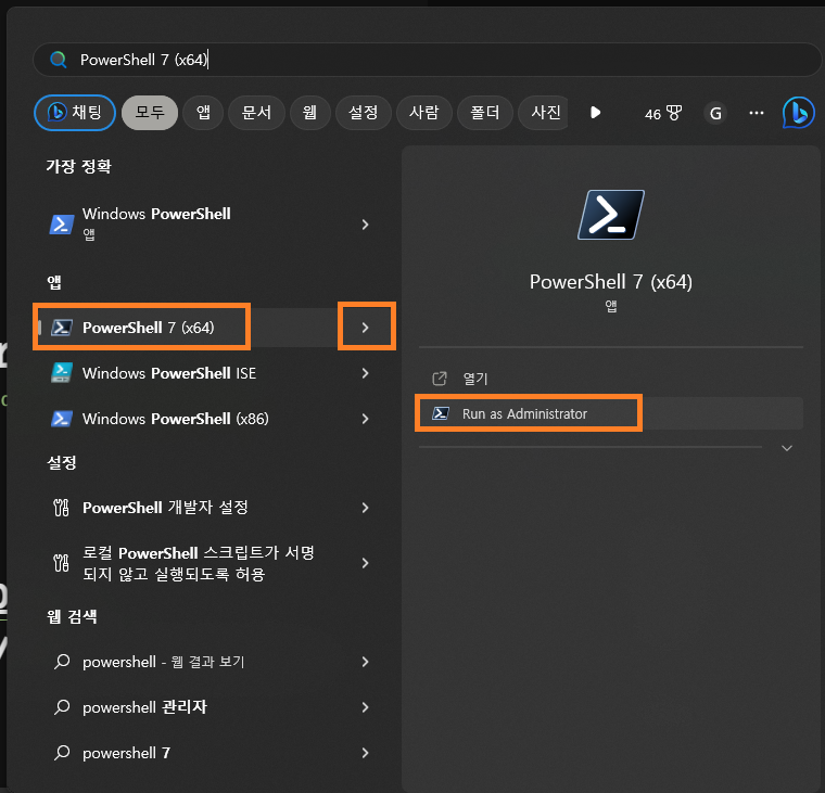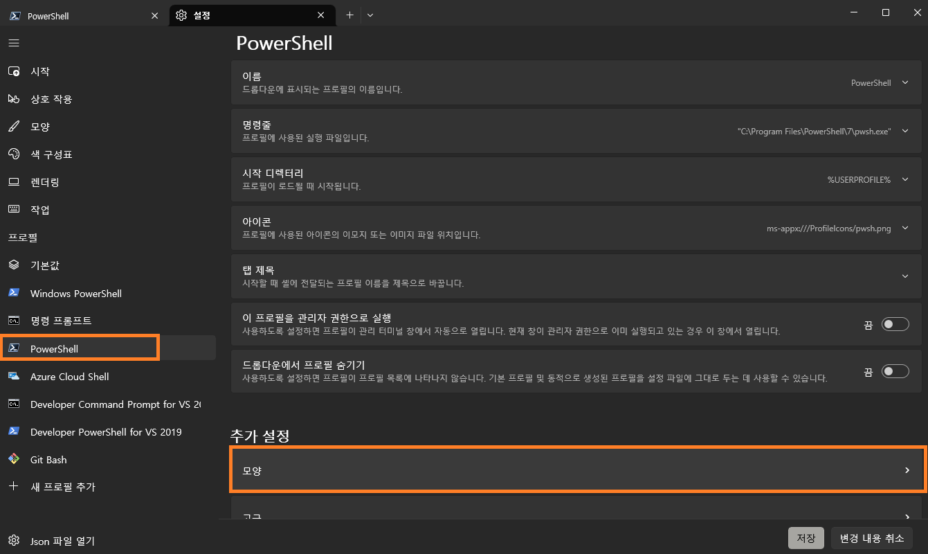 power shell선택 하고, 하단 추가설정 메뉴에서모양을 누른다