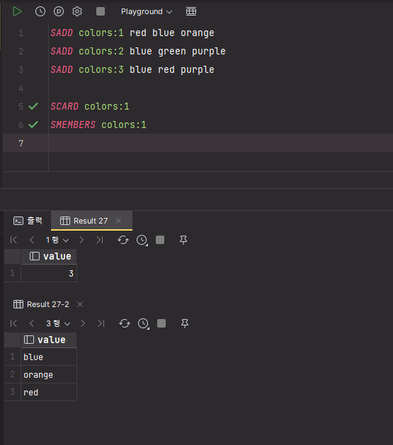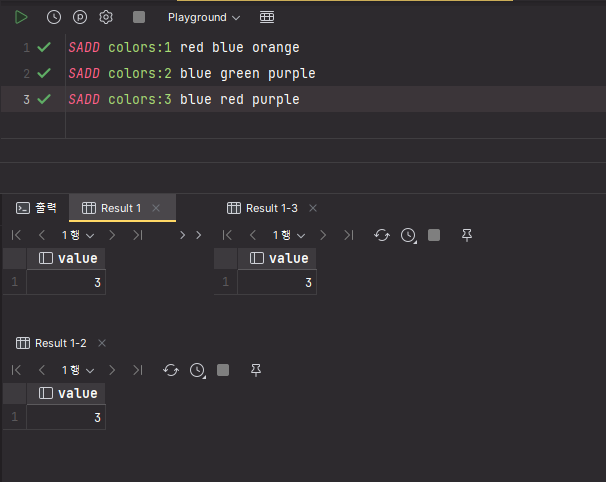 test를 위해 SET 자료구조를 가지는 키 colors:1 , colors:2 , colors:3 생성