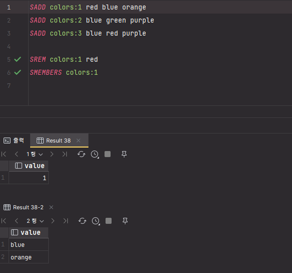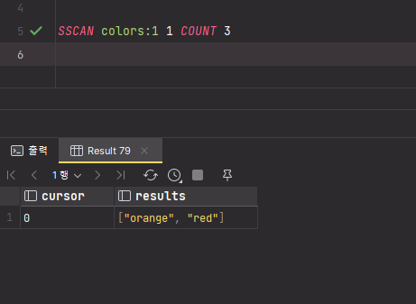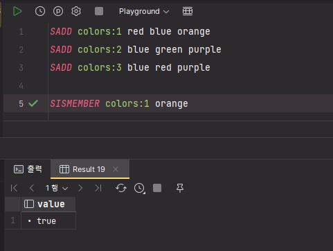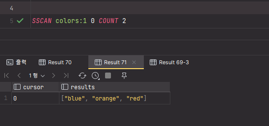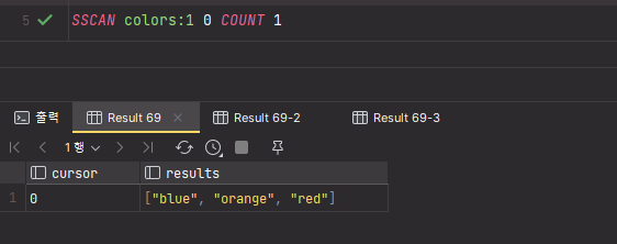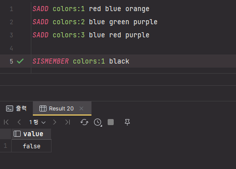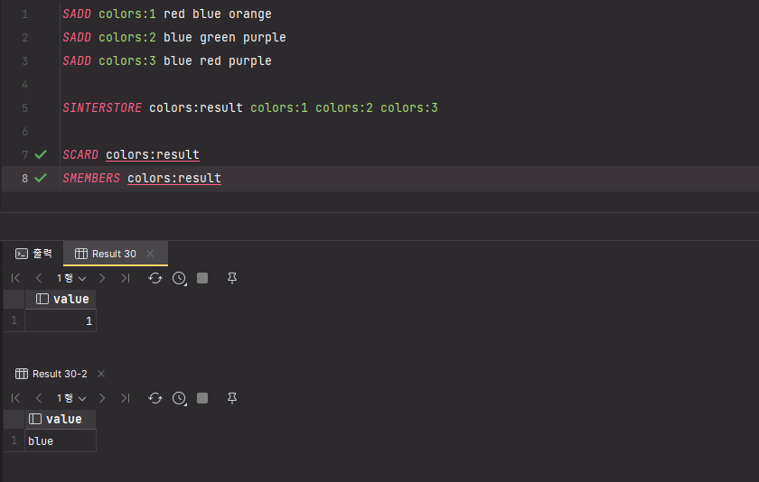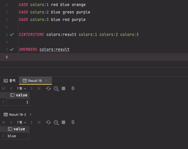 SET 자료구조를 가지는 키 color:1, color:2, color:3 에서 공통으로 갖는 blue 만 출력된 것을 확인할 수 있다.