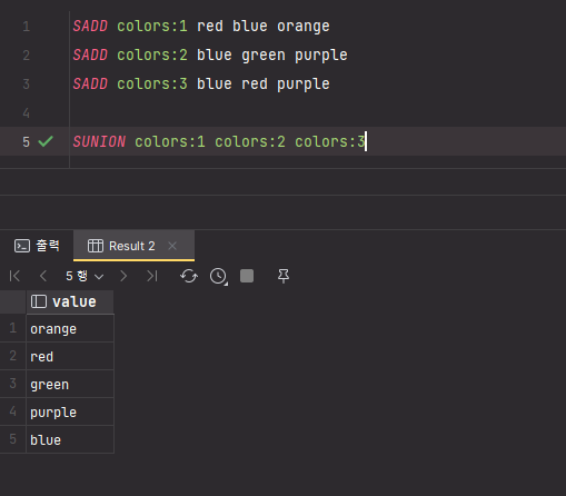방금 생성한 키 3개를 SUNION 명령어를 사용하여 합집합을 만든다.