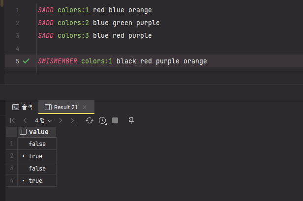SMISMEMBER key member [member2 member3 ... ]나열한 member member2 member3 ... 들이 각각 key에 저장되어있는 값인지 확인