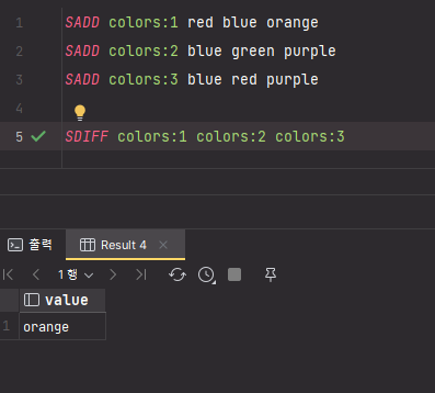 SDIFF colors:1 colors:2 colors:3제일 처음으로 명시한 colors:1 키의 값들에서 colors:2 가 가진 값들과 colors:3 이 가진 값들을 제거하면 orange 만 출력된다.