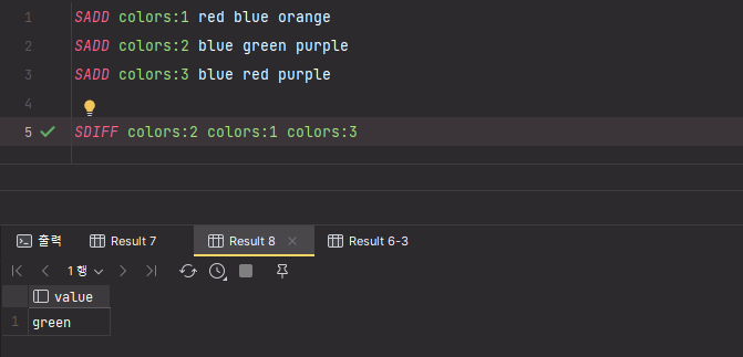 SDIFF colors:1 colors:2 colors:3제일 처음으로 명시한 colors:2 키의 값들에서 colors:1 가 가진 값들과 colors:3 이 가진 값들을 제거하면 green 만 출력된다.