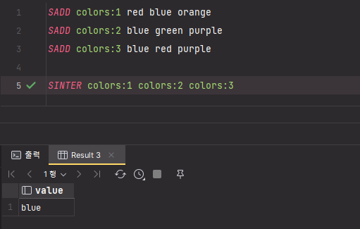 SET 자료구조를 가지는 키 color:1, color:2, color:3 에서 공통으로 갖는 blue 만 출력된 것을 확인할 수 있다.