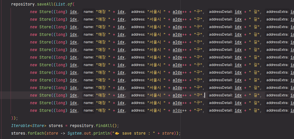 @Entity를 사용했지만, 레디스에서는@RedisHash를 사용한다.import lombok.*; import org.springframework.data.annotation.Id; import org.springframework.data.redis.core.RedisHash; @ToString @Getter @Setter @RedisHash(value = "store") // 여기서 value 를 지정해주지 않으면 패키지명까지 key로 저장됨 @AllArgsConstructor public class Store { @Id private Long id; private String name; private String address; private String addressDetail; private String addressExtra; private double x; private double y; private String description; private double reviewAverageRating; }