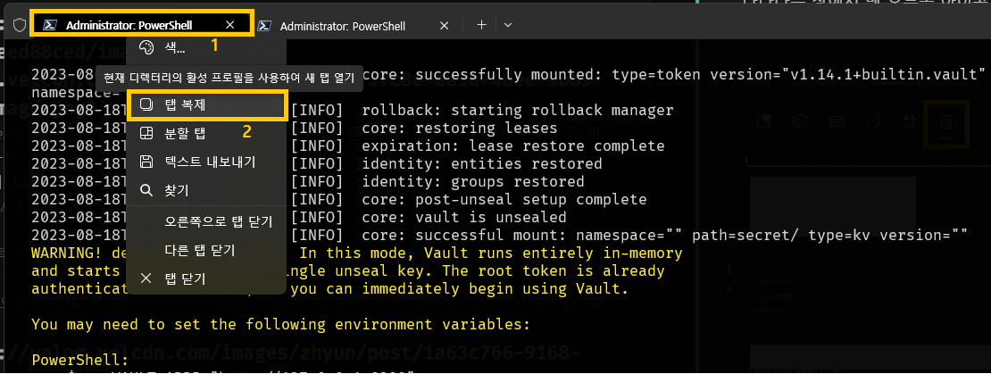 아래 이미지에서 보이는 1 에서 우클릭 후 2 의 탭 복제를 누르면 현재 위치로 새 터미널이 열린다.