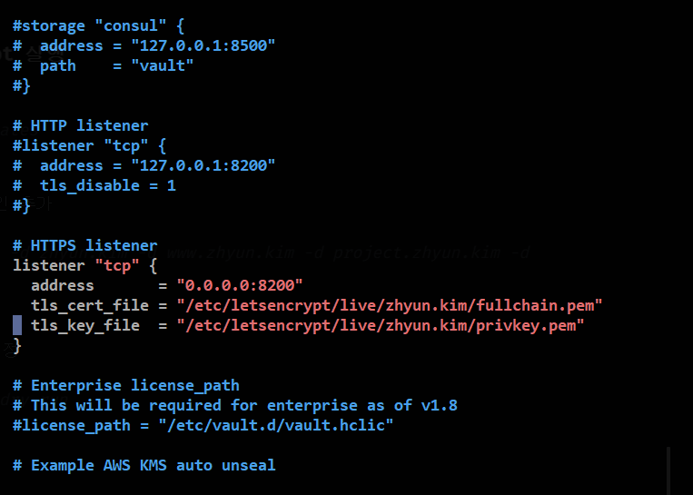 vi /etc/vault.d/vault.hcl# HTTPS listener부분에tls_cert_file,tls_key_file값을 certbot 인증서로 수정 인증서는 shell에서certbot certificates명령어 입력시 알 수 있다.