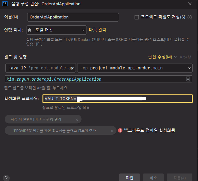 OrderApiApplication으로 실행하면 이상하게 VAULT_TOKEN값이 profile 값으로 뜨는거였다.