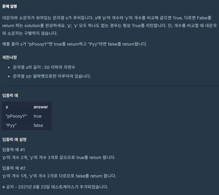 문자열에서 p와P의 개수의 합과, y와Y의 개수의 합을 비교해서 같으면 true를 , 다르면 false를 반환하는 문제이다.