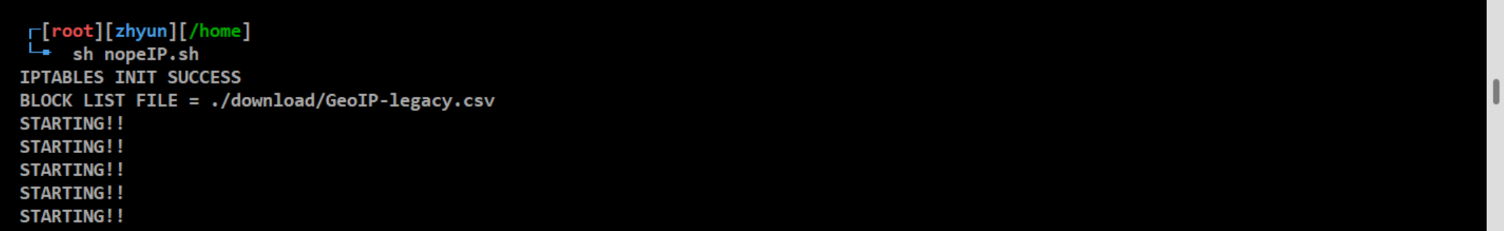 BLOCK_LIST_FILE값을 바꿔줘야 한다. 나는 ip 목록 파일을/home/download위치에GeoIP-legacy.csv이름으로 다운받았기 때문에BLOCK_LIST_FILE=./download/GeoIP-legacy.csv로 수정해주었다. 그리고 코드 중에 iptables 내용을 모두 지워서 초기화한다는 코드가 있어서 해당 부분도 삭제해주었다.#!/bin/sh BLOCK_LIST_FILE=./download/GeoIP-legacy.csv echo "BLOCK LIST FILE = $BLOCK_LIST_FILE" # ADD BLOCK TARGET LIST ALLOW_TARGET_COUNTRY="Korea" # REGIST BLOCK IP FOR LOOP for IP_BANDWIDTH in `egrep -v $ALLOW_TARGET_COUNTRY $BLOCK_LIST_FILE | awk -F, '{print $1, $2}' | awk -F\" '{print $2"-"$4}'` do echo "STARTING!!" sudo iptables -I INPUT -p all -m iprange --src-range $IP_BANDWIDTH -j DROP done sudo iptables -L