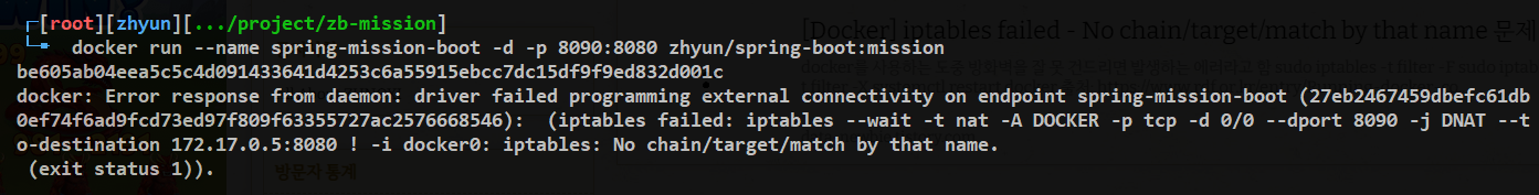 이번엔 iptables failed 문구가 뜨면서 도커 컨테이너 실행이 안되었다 😬