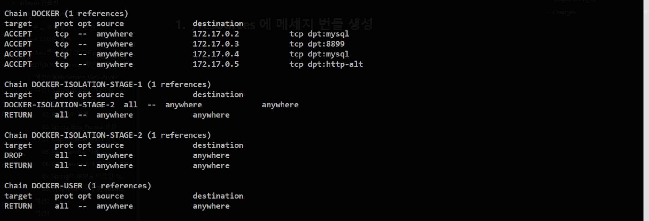 다시 활성화를 시켜놓고 iptables를 조회해보니 도커 관련한 정보들이 눈에 들어왔다.