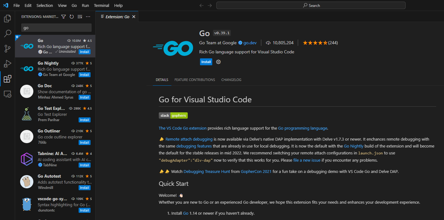 "go" 검색 후 install 버튼 클릭