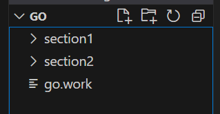 go ├─ section1 │ ├─ go.mod │ └─ test.go ├─ section2 │ ├─ go.mod │ └─ var1.go └─ go.workgo 프로젝트 안에 section1 프로젝트와 section2 프로젝트가 있다고 볼 수 있다.