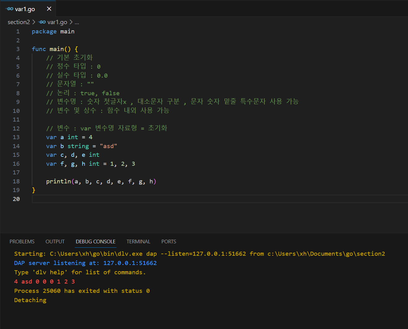 go ├─ section1 │ ├─ go.mod │ └─ test.go ├─ section2 │ ├─ go.mod │ └─ var1.go └─ go.workgo 프로젝트 안에 section1 프로젝트와 section2 프로젝트가 있다고 볼 수 있다.