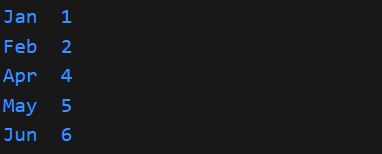 package main import "fmt" function main() { const ( Jan = iota + 1 Feb Mar Apr May Jun ) fmt.Println("Jan ", Jan) fmt.Println("Feb ", Feb) fmt.Println("Mar ", Mar) fmt.Println("Apr ", Apr) fmt.Println("May ", May) fmt.Println("Jun ", Jun) }출력값