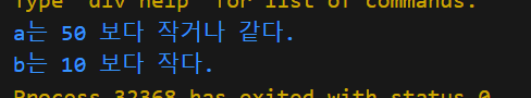 package main import "fmt" func main() { a := 10 if a > 100 { fmt.Println("a는 100 보다 크다.") } else if a > 50 { fmt.Println("a는 50 보다 크다.") } else { fmt.Println("a는 50 보다 작거나 같다.") } if b := 1; b < 10 { fmt.Println("b는 10 보다 작다.") } }실행 결과