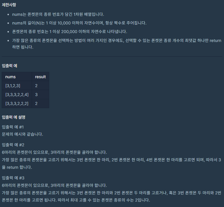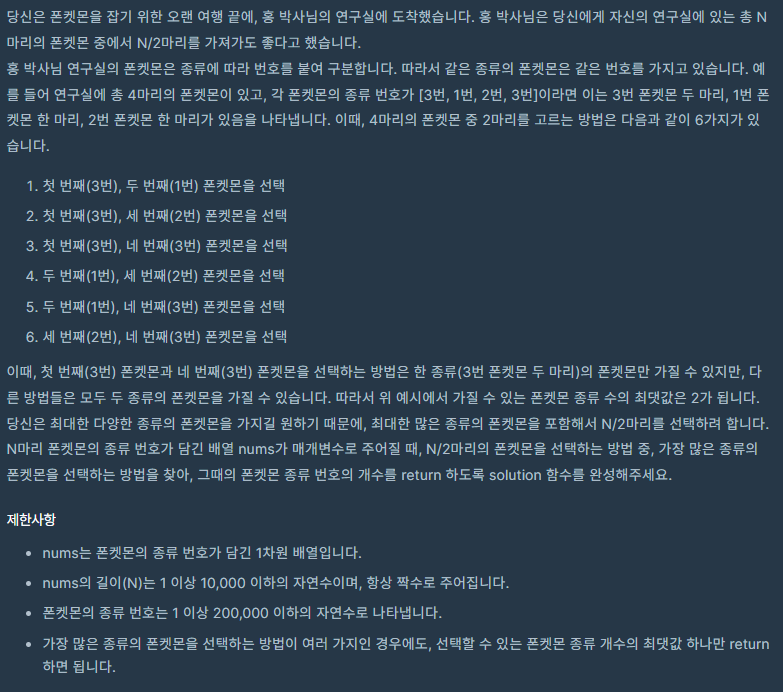 문제의 핵심은 중복 없이 가져갈수 있는 폰켓몬의 종류의 개수는? 이었다
