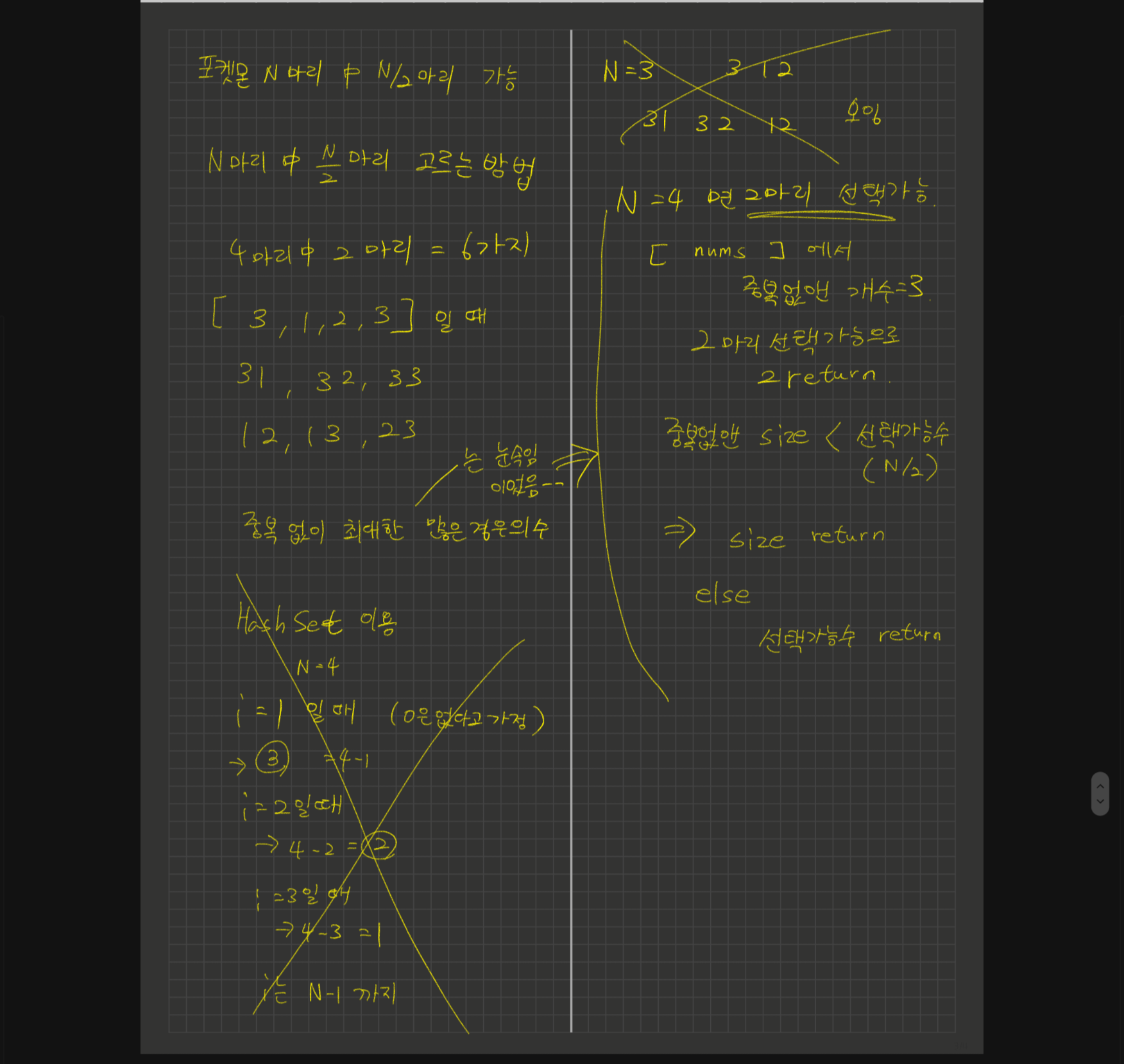 import java.util.HashSet; class Solution { public int solution(int[] nums) { HashSet<Integer> set = new HashSet<>(); for(int i: nums) { set.add(i); } return nums.length / 2 > set.size() ? set.size() : nums.length / 2; } }HashSet에 배열의 요소들을 집어넣어 중복을 없앤 후 HashSet의 크기와 nums.length/2 의 값 중 작은 값을 결과로 출력되게 작성하였다.