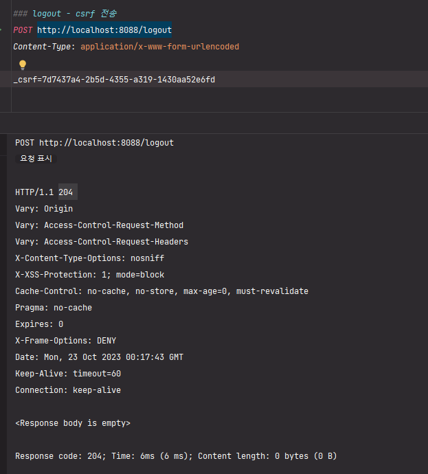 Content Type은application/x-www-form-urlencoded로, 데이터 형태는_csrf=복사한코드형태로 보내야 한다.응답 값에 204 상태코드가 뜨면 성공!