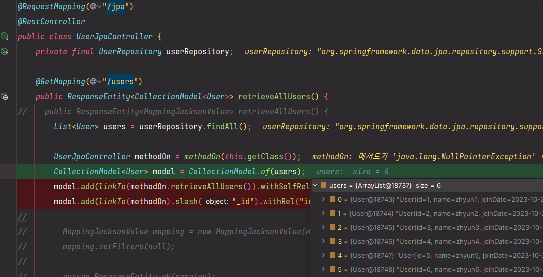 @Slf4j @RequiredArgsConstructor @RequestMapping("/jpa") @RestController public class UserJpaController { private final UserRepository userRepository; @GetMapping("/users") public ResponseEntity<MappingJacksonValue> retrieveAllUsers() { List<User> users = userRepository.findAll(); UserJpaController methodOn = methodOn(this.getClass()); CollectionModel<User> model = CollectionModel.of(users); model.add(linkTo(methodOn.retrieveAllUsers()).withSelfRel().withType("GET")); model.add(linkTo(methodOn).slash("_id").withRel("info-user").withType("GET")); MappingJacksonValue mapping = new MappingJacksonValue(model); mapping.setFilters(null); return ResponseEntity.ok(mapping); } @GetMapping("/users/{id}") public ResponseEntity<MappingJacksonValue> retrieveUser(@PathVariable int id) { Optional<User> optionalUser = userRepository.findById(id); if (!optionalUser.isPresent()) throw new UserNotFoundException(String.format("없는 사용자 입니다. [id : %d]", id)); EntityModel<User> model = EntityModel.of(optionalUser.get()); model.add(linkTo(methodOn(this.getClass()).retrieveUser(id)).withSelfRel().withType("GET")); model.add(linkTo(methodOn(this.getClass()).retrieveAllUsers()).withRel("all-users").withType("GET")); MappingJacksonValue mapping = new MappingJacksonValue(model); mapping.setFilters(null); return ResponseEntity.ok(mapping); } }id 필드가 포함된 응답 결과 - API GET "/users/{id}"