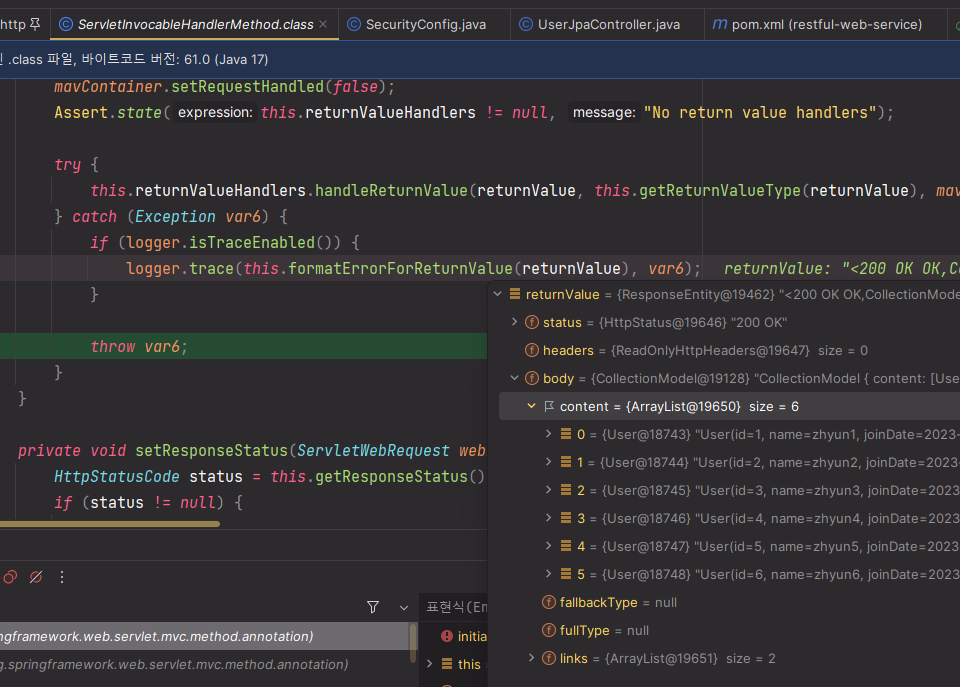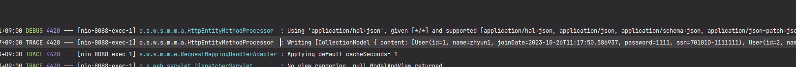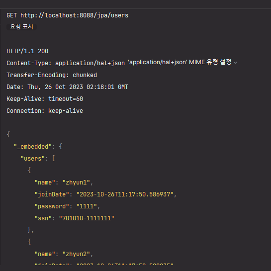 GET http://localhost:8088/jpa/users/1 HTTP/1.1 200 Content-Type: application/hal+json Transfer-Encoding: chunked Date: Wed, 25 Oct 2023 09:54:27 GMT Keep-Alive: timeout=60 Connection: keep-alive { "name": "zhyun1", "joinDate": "2023-10-25T18:54:22.185935", "password": "1111", "ssn": "701010-1111111", "_links": { "self": { "href": "http://localhost:8088/jpa/users/1", "type": "GET" }, "all-users": { "href": "http://localhost:8088/jpa/users", "type": "GET" } } } 응답 파일이 저장되었습니다. > 2023-10-25T185427.200.json Response code: 200; Time: 700ms (700 ms); Content length: 346 bytes (346 B)원하던 결과 : User 객체의 id 필드가 출력되는 코드