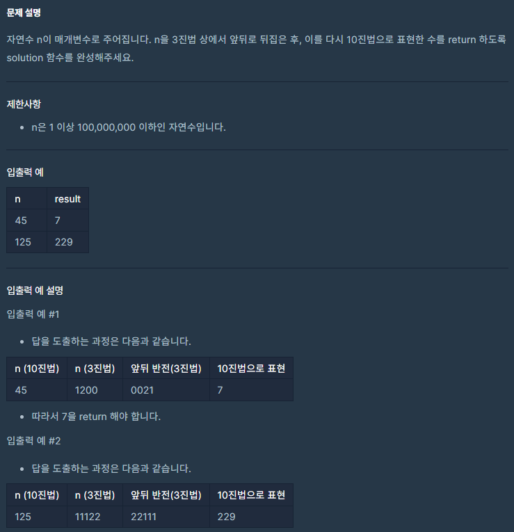 class Solution { public int solution(int n) { int answer = 0; int base = 3; String samJinSu = makeReverseSamJinSu(n, 1, base, ""); answer = Integer.parseInt(samJinSu.substring(samJinSu.length()-1)); for (int i = samJinSu.length() - 2; i >= 0; i--) { answer += Integer.parseInt(samJinSu.charAt(i) + "") * base; base *= 3; } return answer; } String makeReverseSamJinSu(int num, int x, int base, String result) { if (num / x < base) { result = num / x + result; if (num % x != 0) { num = num % x; x /= base; } else { return result; } } else { if (!"".equals(result)) result = 0 + result; x *= base; } return makeReverseSamJinSu(num, x, base, result); } }코드 작성 다 하고 정답 떠서 엄청 뿌듯했는데~~ㅋㅋㅋㅋㅋㅋㅋㅋㅋㅋㅋㅋㅋㅋㅋㅋㅋㅋㅋㅋ 두시간 걸림 🥲 심지어 메모도 했는뎅..........