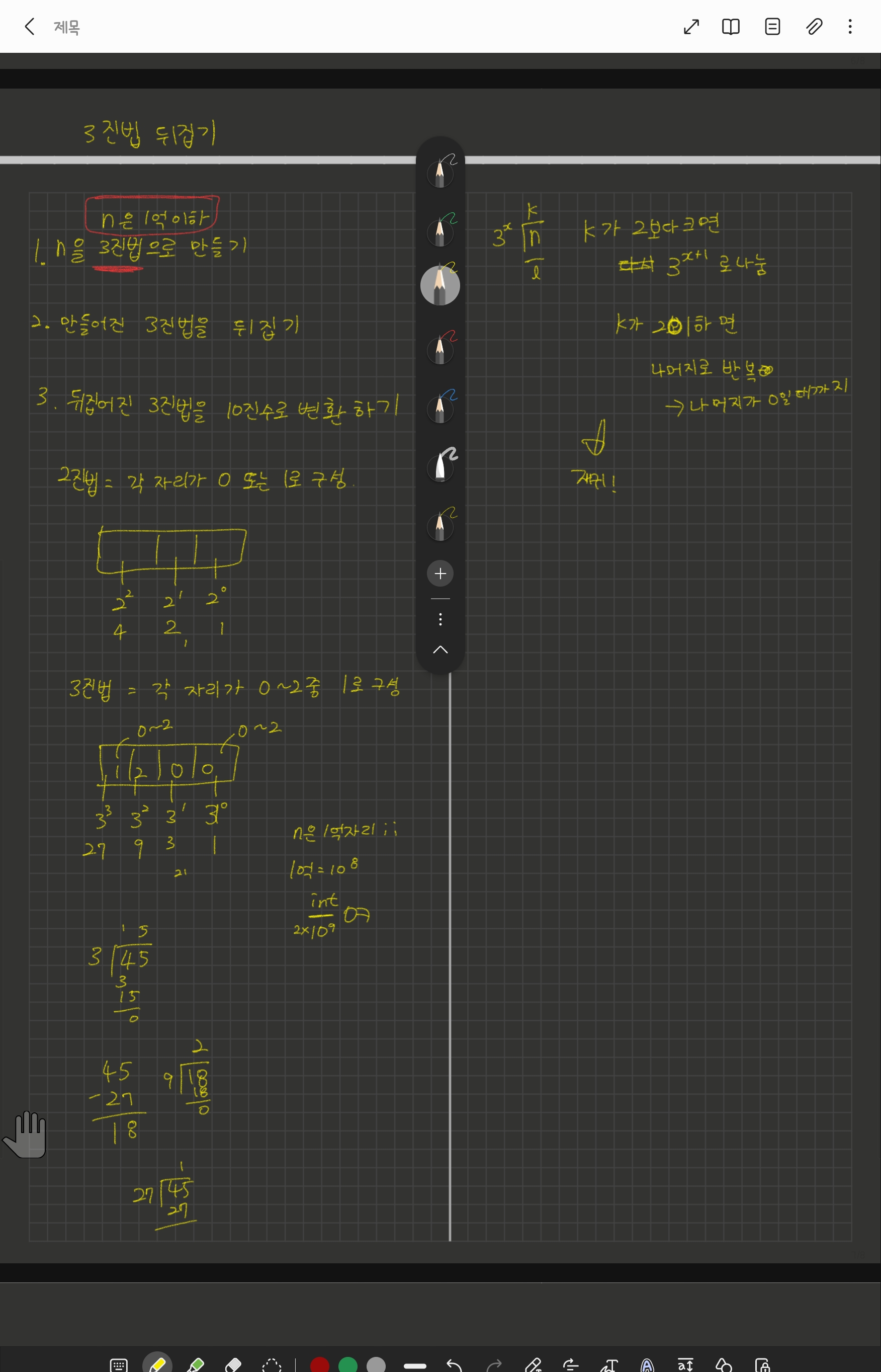 String a = ""; while(n > 0){ a = (n % 3) + a; n /= 3; }이렇게 하면 쉽게 3진수로 계산이 되었다. 뒤집힌 3진수를 만들려면