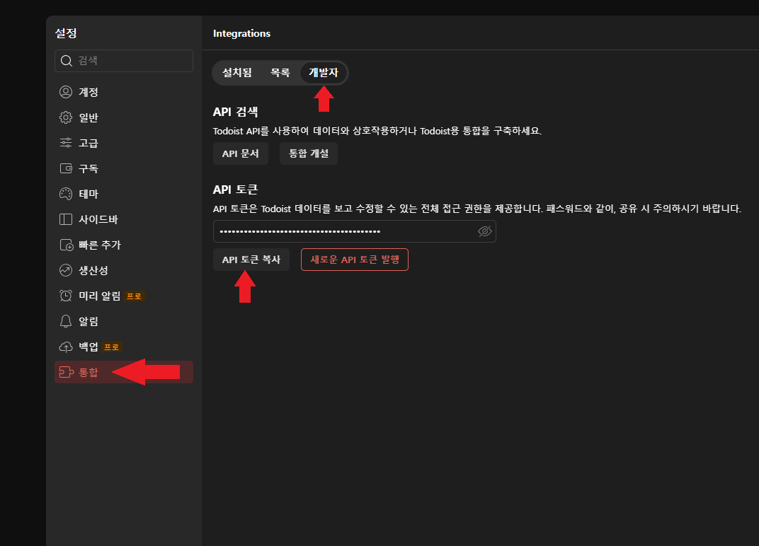 3. 통합 - 개발자 - API 토큰 복사