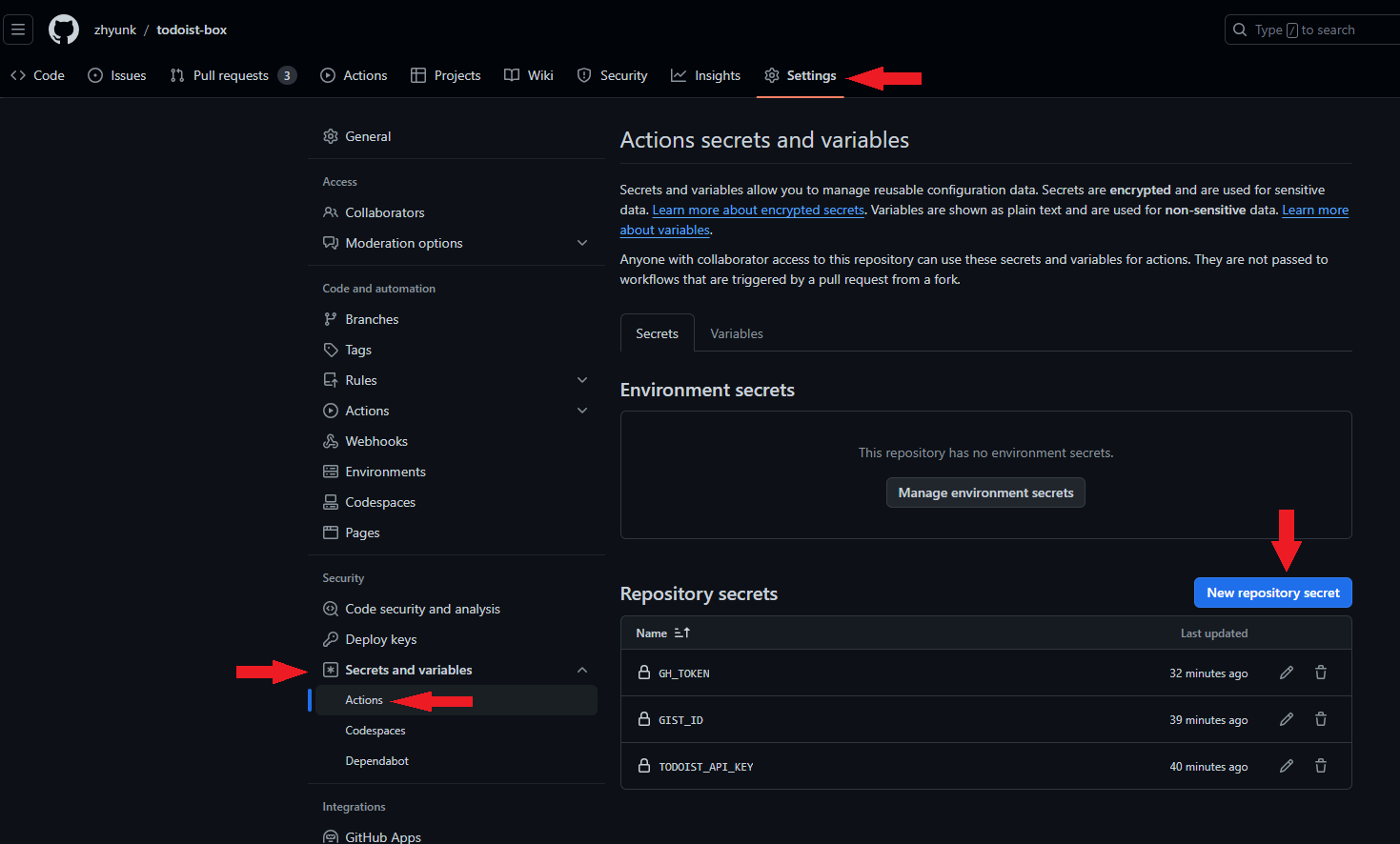 - NAME : TODOIST_API_KEY , Secret : 복사한 토큰 입력