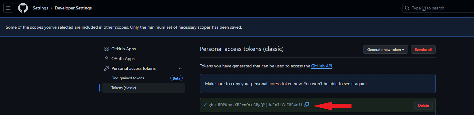 3. Personal access tokens - Token - Generate new token 클릭