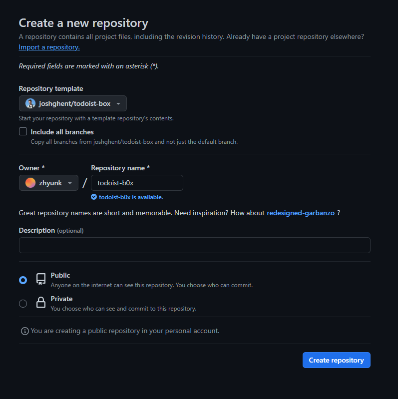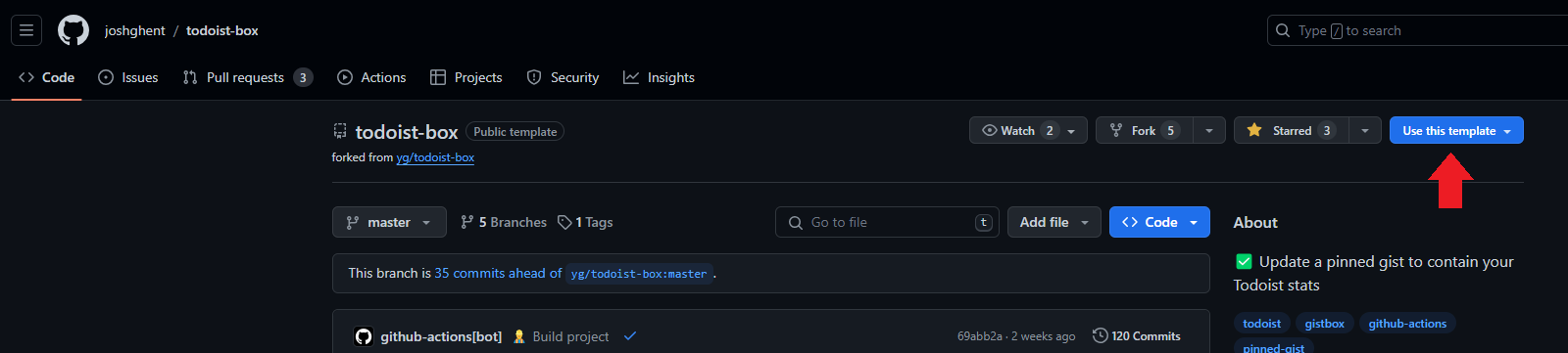 4. https://github.com/joshghent/todoist-box 템플릿으로 리포지터리를 생성한다.