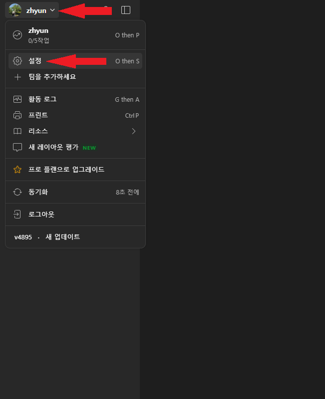 2. 좌측 상단의 계정 클릭 - 설정 클릭