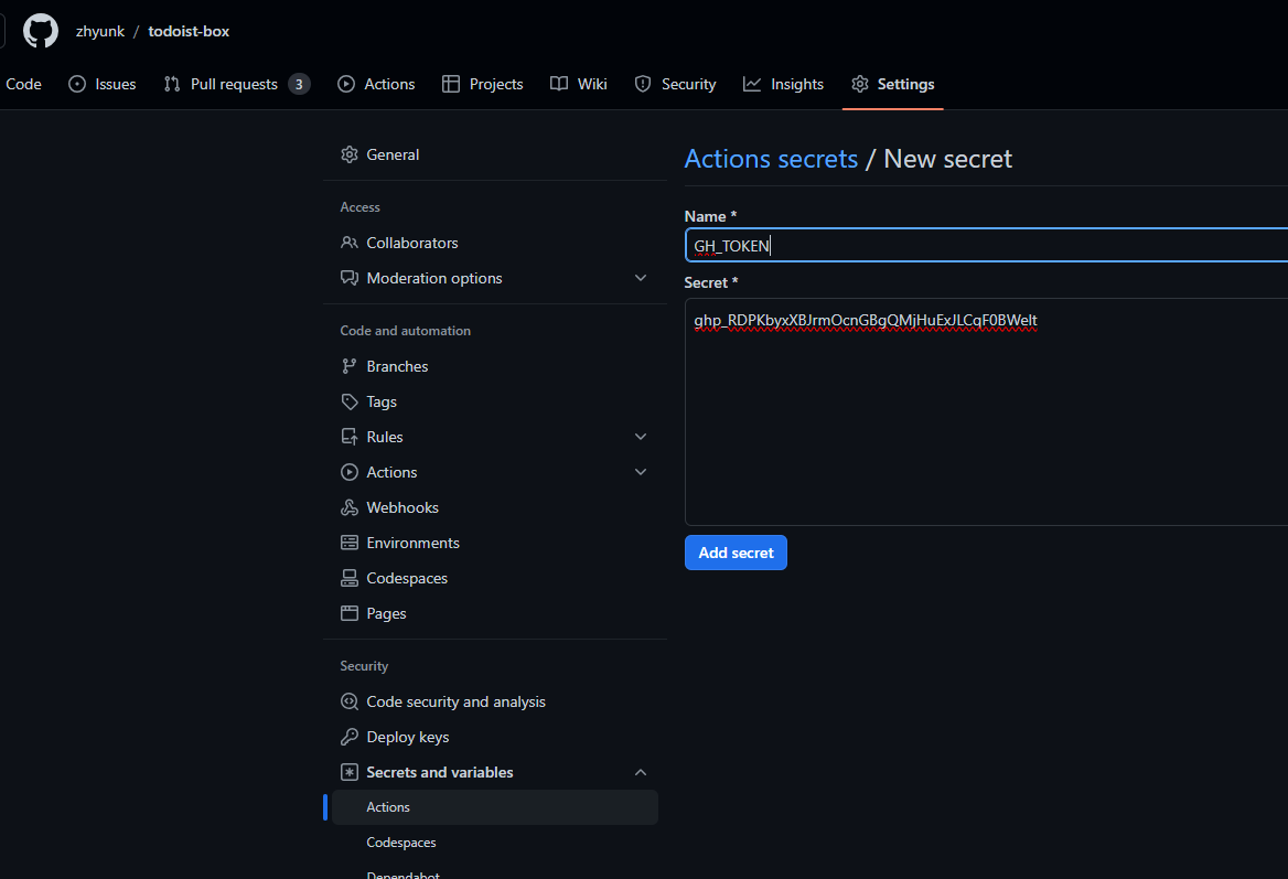 - NAME : GH_TOKEN , Secret : 복사한 키 입력