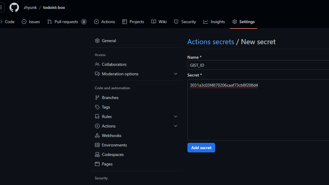 2. NAME : GIST_ID , Secret : gist 주소 입력 후 Add secret 클릭