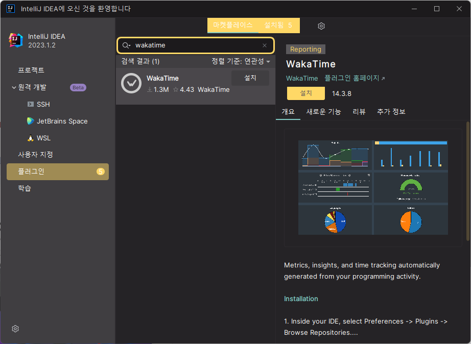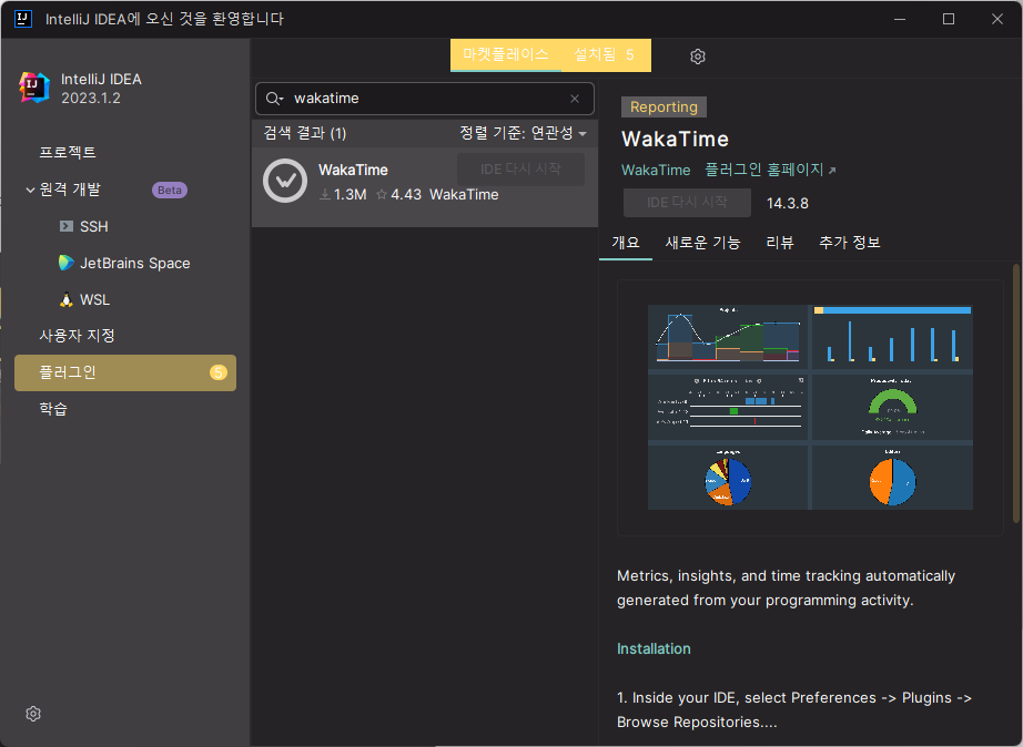 1. intelliJ 실행 - 플러그인 - wakatime (마켓플레이스에서)검색 - 설치 - IDE 다시 시작 클릭!