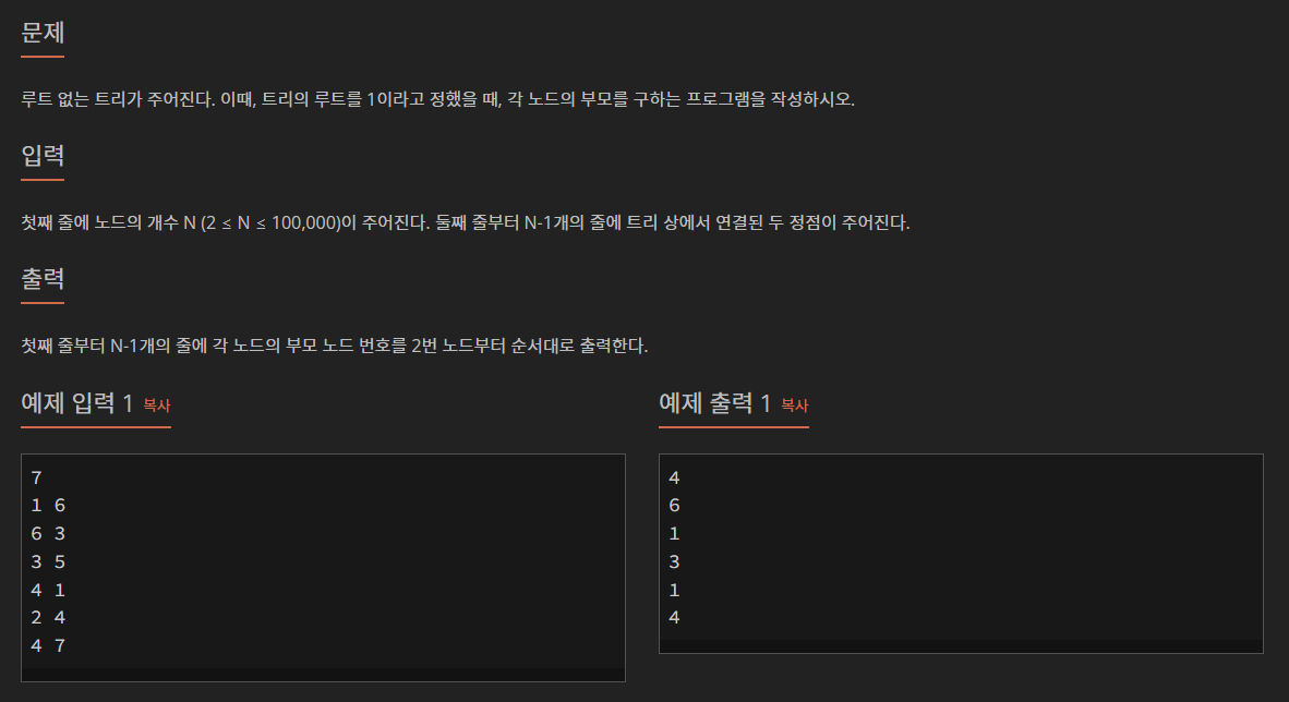 import java.io.*; import java.util.*; public class Main { public static void main(String[] args) throws IOException { BufferedReader br = new BufferedReader(new InputStreamReader(System.in)); int n = Integer.parseInt(br.readLine()); Tree tree = new Tree(n); for (int i = 1; i < n; i++) { StringTokenizer st = new StringTokenizer(br.readLine(), " "); int a = Integer.parseInt(st.nextToken()); int b = Integer.parseInt(st.nextToken()); tree.addEdge(a, b); } tree.bfs(1); tree.printParents(); } } class Tree { private ArrayList<ArrayList<Integer>> list; private int[] parents; private int size; public Tree(int n) { size = n; list = new ArrayList<>(); parents = new int[n + 1]; for (int i = 0; i <= n + 1; i++) { list.add(new ArrayList<>()); } } public void addEdge(int a, int b) { list.get(a).add(b); list.get(b).add(a); } public void bfs(int start) { Queue<Integer> queue = new LinkedList<>(); boolean[] visited = new boolean[size + 1]; visited[start] = true; queue.add(start); while (!queue.isEmpty()) { int currentNode = queue.poll(); for (int nextNode : list.get(currentNode)) { if (!visited[nextNode]) { visited[nextNode] = true; parents[nextNode] = currentNode; queue.add(nextNode); } } } } public void printParents() { for (int i = 2; i <= size; i++) { System.out.println(parents[i]); } } }트리는 그래프의 한 종류로서 특정한 제약 조건을 충족하는 계층적인 구조를 가지고 있다. 루트 노드가 있으면 트리, 루트 노드가 없으면 그래프라고 볼 수도 있다. 어려웡 🙄 트리와 그래프. BFS, DFS