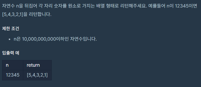 public int[] solution(long n) { int[] answer = new int[(n + "").length()]; for (int i = 0; i < answer.length; i++, n /= 10) { answer[i] = (int)(n % 10); } return answer; }간단한 문제라고 판단되서 메모와 타이머 측정을 하지 않았다. 히히