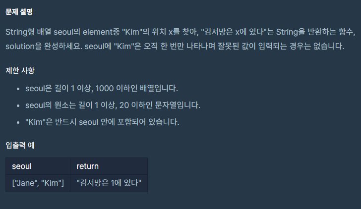 class Solution { public String solution(String[] seoul) { return "김서방은 "+ Arrays.asList(seoul).indexOf("Kim") + "에 있다"; } }Arrays.asList( )에 참조 자료형 배열을 넣어주면 List가 됨.Collection.indexOf( 값 );을 하면 몇번 index에 값이 들어있는지 알 수 있다. 🤓내 코드
