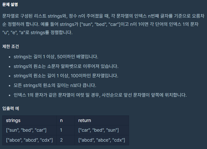 import java.util.*; class Solution { public String[] solution(String[] strings, int n) { Arrays.sort(strings, (String s1, String s2) -> { if (s1.charAt(n) < s2.charAt(n)) return -1; if (s1.charAt(n) > s2.charAt(n)) return 1; if (s1.charAt(n) == s2.charAt(n)) return s1.compareTo(s2); return 0; }); return strings; } }😊