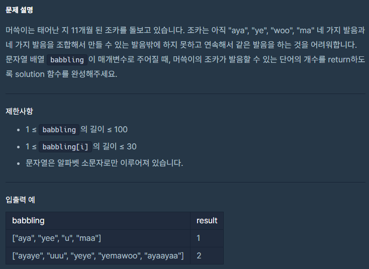 class Solution { public int solution(String[] babbling) { int answer = 0; String[] words = {"aya", "ye", "woo", "ma"}; for (String b: babbling) { for (String word: words) { if (!b.contains(word + word)) b = b.replace(word, " "); } if ("".equals(b.replace(" ", ""))) answer++; } return answer; } }