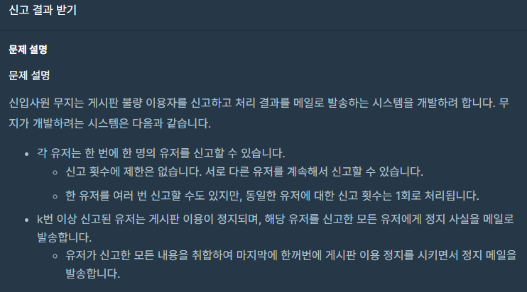 import java.util.*; import java.util.*; class Solution { public int[] solution(String[] id_list, String[] report, int k) { int[] answer = new int[id_list.length]; HashMap<String, ArrayList<String>> userTo = new HashMap(); HashMap<String, Integer> userFrom = new HashMap(); for (String id: id_list) { userTo.put(id, new ArrayList<>()); userFrom.put(id, 0); } for (String repo: report) { String[] fromTo = repo.split(" "); if (userTo.get(fromTo[0]).contains(fromTo[1])) continue; userTo.get(fromTo[0]).add(fromTo[1]); userFrom.put(fromTo[1], userFrom.get(fromTo[1]) + 1); } for (String repo: report) { String[] fromTo = repo.split(" "); if (userFrom.get(fromTo[1]) < k) { userTo.get(fromTo[0]).remove(fromTo[1]); } } int idx = 0; for (String id: id_list) { answer[idx++] = userTo.get(id).size(); } return answer; } }🤔