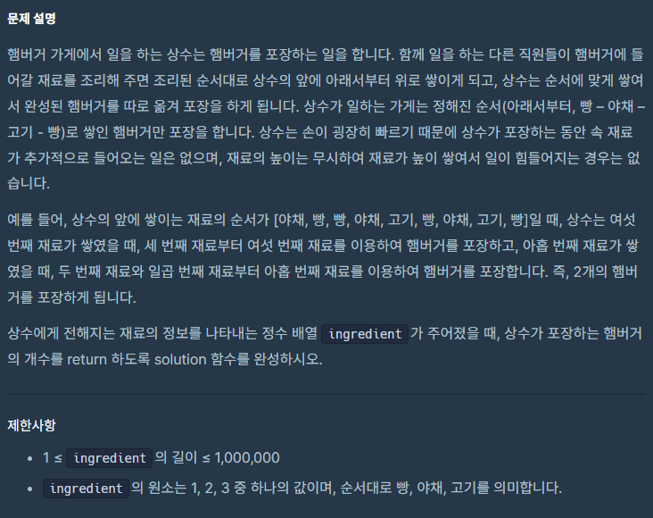 import java.util.*; class Solution { public int solution(int[] ingredient) { int answer = 0; ArrayList<Integer> temp = new ArrayList(); for (int i: ingredient) { temp.add(i); int size = temp.size(); if (size >= 4 && temp.get(size - 1) == 1 && temp.get(size - 2) == 3 && temp.get(size - 3) == 2 && temp.get(size - 4) == 1) { temp.remove(--size); temp.remove(--size); temp.remove(--size); temp.remove(--size); answer++; } } return answer; } }이번 문제로 많은 것을 배움 📝🤓