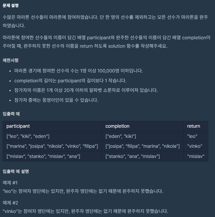 프로그래머스: 완주하지 못한 선수코딩테스트 문제 풀이/다시 풀어볼 문제 2023. 11. 23. 00:09