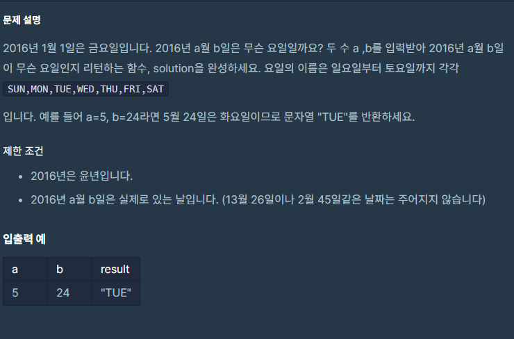class Solution { public String solution(int a, int b) { int[] month = new int[]{31, 29, 31, 30, 31, 30, 31, 31, 30, 31, 30, 31}; String[] yoil = new String[]{"FRI", "SAT", "SUN", "MON", "TUE", "WED", "THU"}; int temp = b - 1; for (int i = 0; i < a - 1; i++) { temp += month[i]; } return yoil[temp % 7]; } }'코딩테스트 문제 풀이 > 프로그래머스' 카테고리의 다른 글